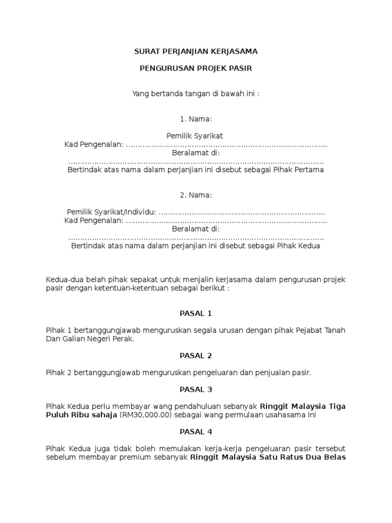 Related : Contoh Surat Perjanjian Kerjasama Perniagaan - Pada hari ini, kami yang bertanda tangan di bawah ini, 1..