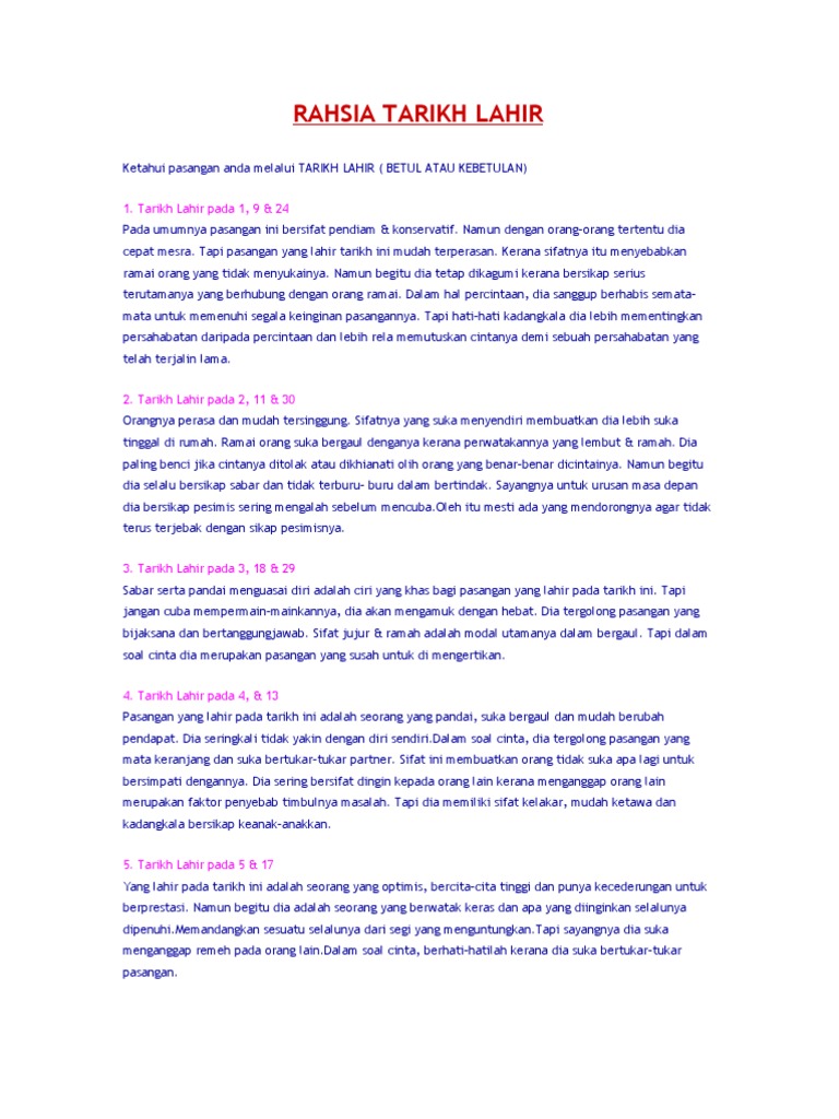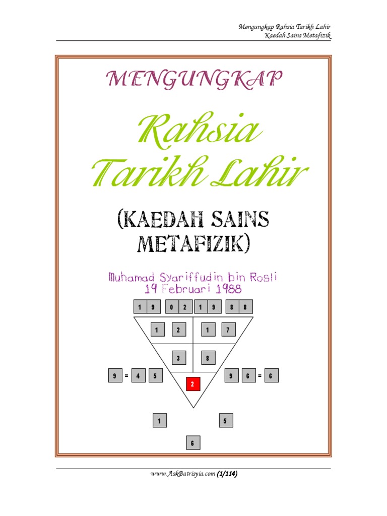 Jangan berlengah lagi, segera buat keputusan sekarang. Karakter dari zodiak rising sign merupakan versi dirimu yang pertama dilihat seseorang. Dia adalah seorang pasangan yang tidak mahu kalah dan pantang menyerah. Metafizik penomboran rahsia tarikh lahir, analisa potensi secara online, murah dan jimat masa! What does your birth date mean? Text of rahsia tarikh lahir. Ungkaikanlah rahsia tarikh lahir anda dan praktik kan strategi yang telah diberikan untuk mencapai matlamat anda. Laporan rahsia tarikh lahir lengkap ini akan membuat anda lebih mengenali diri anda sendiri dengan lebih mendalam. Selepas melakukan kajian selama beberapa tahun, dato' dr. Ayuh, bangkitlah untuk mendapatkan satu kehidupan yang cemerlang dan gemilang. Fadzilah kamsah berjaya mencungkil rahsia tarikh lahir dan kaitannya dengan personaliti seseorang! Pendek kata, tarikh lahir individu perlulah disusun mengikut format ab.cd.efgh. Ebook the science of getting rich (setebal 77 ms) 3.